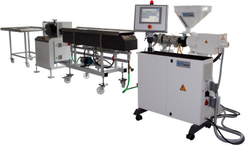 LaborextruderDer SKETmatik Laborextruder ist als flexibeles Extruder-System konzeptioniert.Mit wenigen Handgriffen ist die Verfahrenseinheit zu tauschen. Hierdurch ist es möglich, mit einem Grundsystem durch Erweiterungen viele Anwendungsfälle im Labor zu untersuchen. Gleichzeitig ist die Automatisierungstechnik so ausgelegt, dass die Steuerung eine Vielzahl von Daten wie z. B. Druck- und Temperarturverteilung über dem Zylinder, Drehmoment, Schneckendrehzahl etc. auslesen und speichern kann. Die gewonnenen Daten können über ein Datenfile exportiert werden. Damit können diese z. B. als Excel-File kundenseitig bearbeitet werden. Die Möglichkeit einer Netzwerkanbindung über Ethernet ist durch Intergration dieser Schnittstelle im Laborextruder gegeben.Das Design der Verfahrenseinheit und damit z. B. deren Länge wird nach Kundenspezifikation ausgelegt.Der zur Zeit kleinste Laborextruder aus unserem Hause hat einen Schneckendurchmesser von 16 mm bei einer Verfahrenslänge von 27D. Der spezifische Ausstoß beträgt nur 0,025kg/Stunde und Schnecken-Umdrehung. Das Einsatzfeld ist hier die Erforschung der Mikroextrusion.